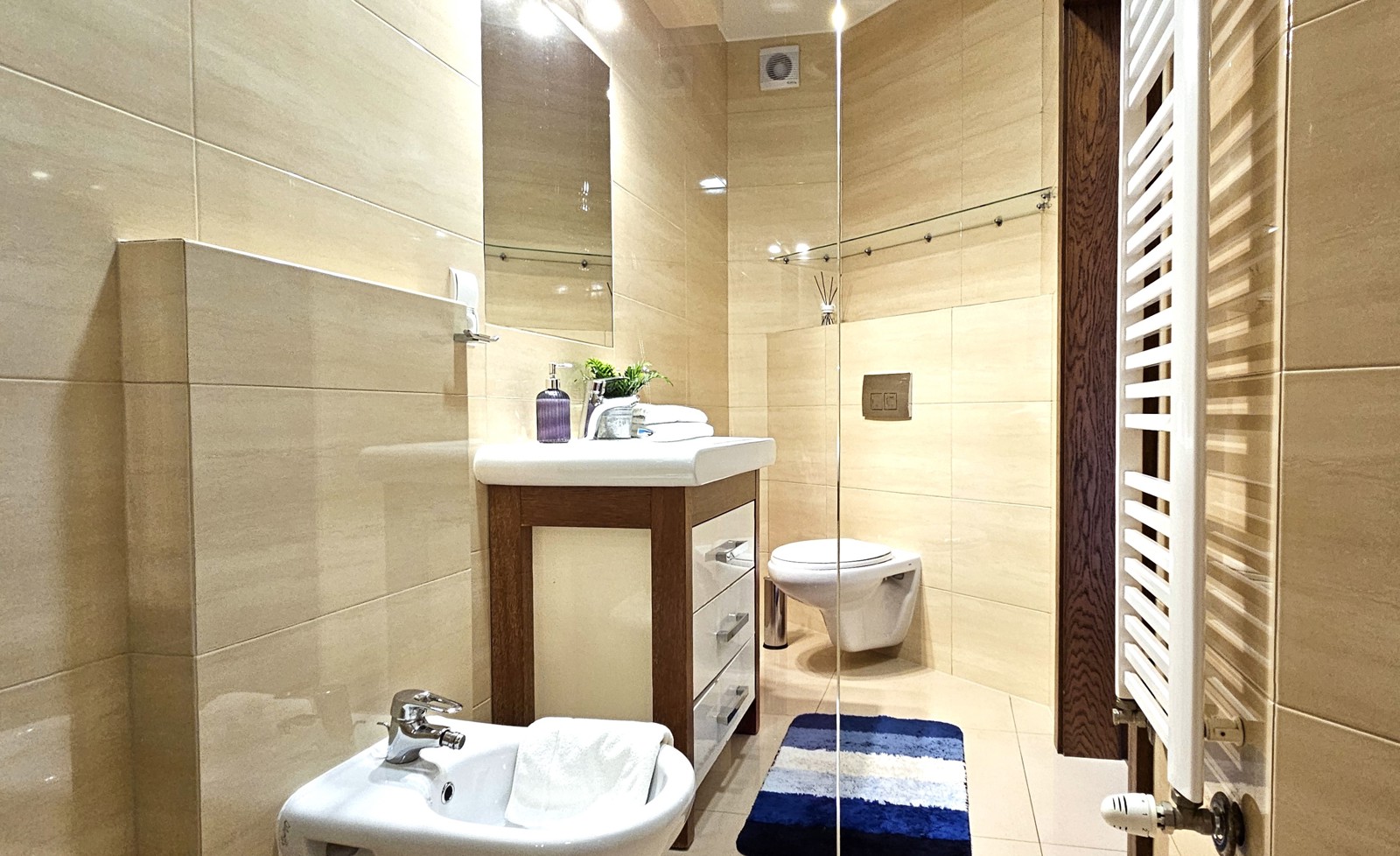 Łazienka z WC, prysznicem, suszarką do włosów, bidet