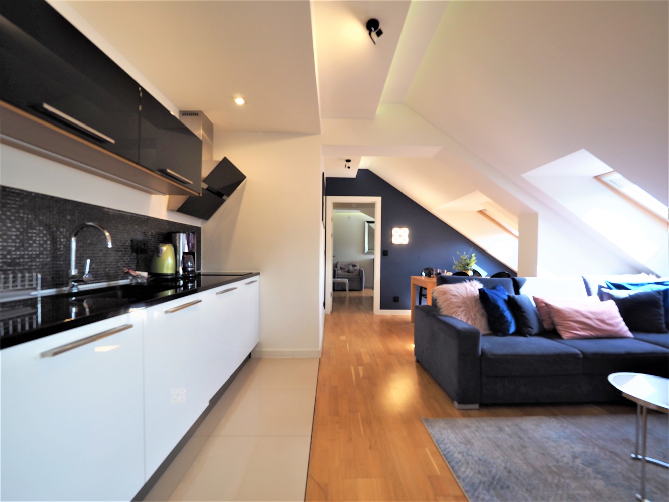 W pełni wyposażony aneks kuchenny posiada chłodziarko-zamrażarkę, płytę indukcyjną, kuchenkę mikrofalową, ekspres do kawy, czajnik elektryczny, opiekacz do kanapek/ toster, sprzęty kuchenne.