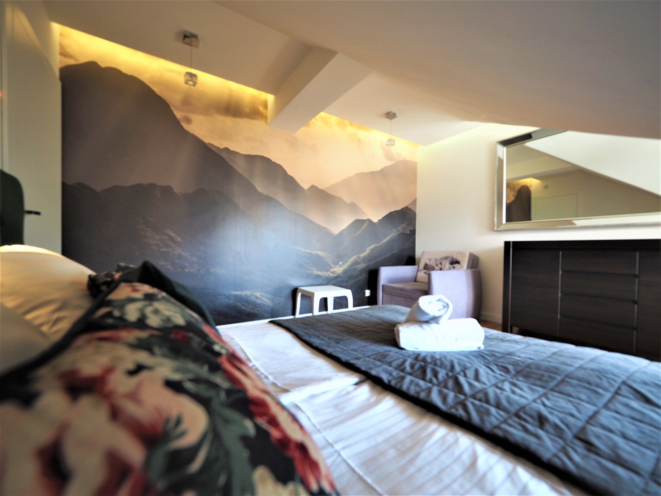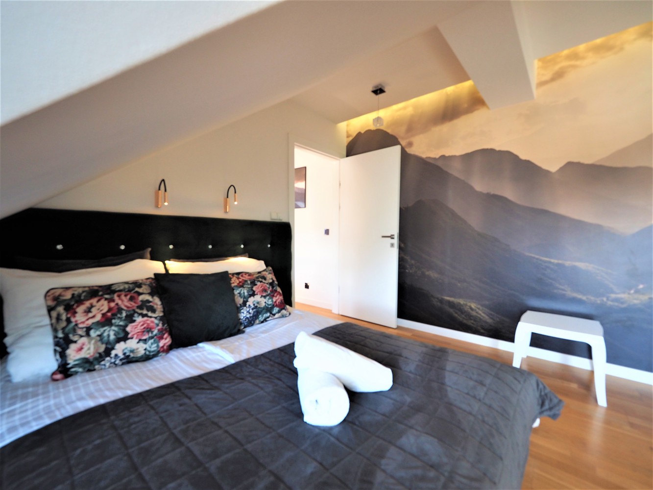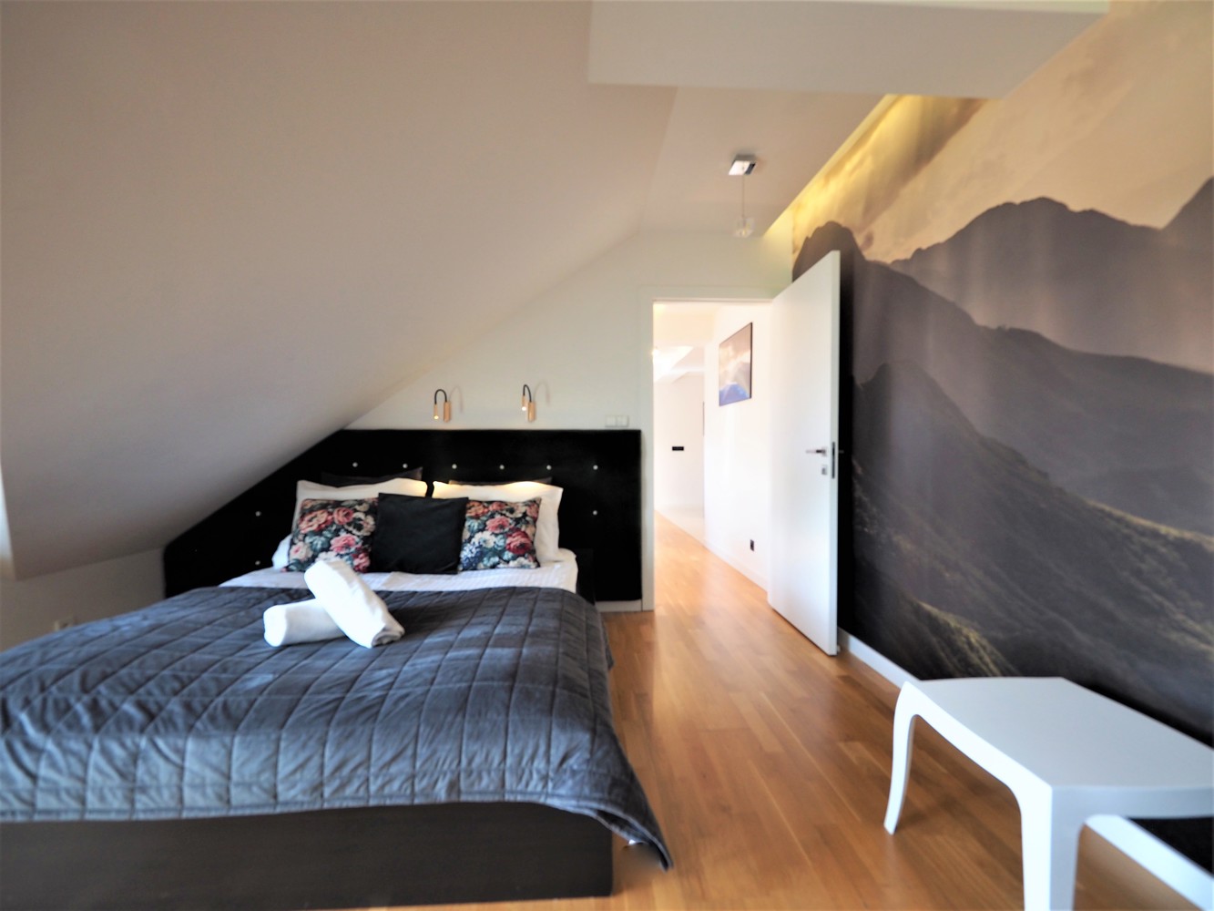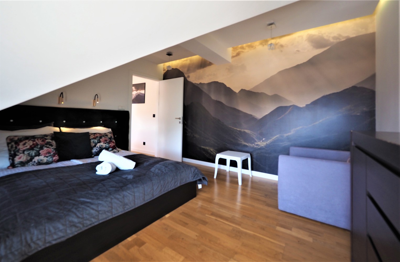 Sypialnia - łóżko małżeńskie 2-osobowe, balkon z widokiem na Tatry, rozkładany fotel dla 1 osoby.