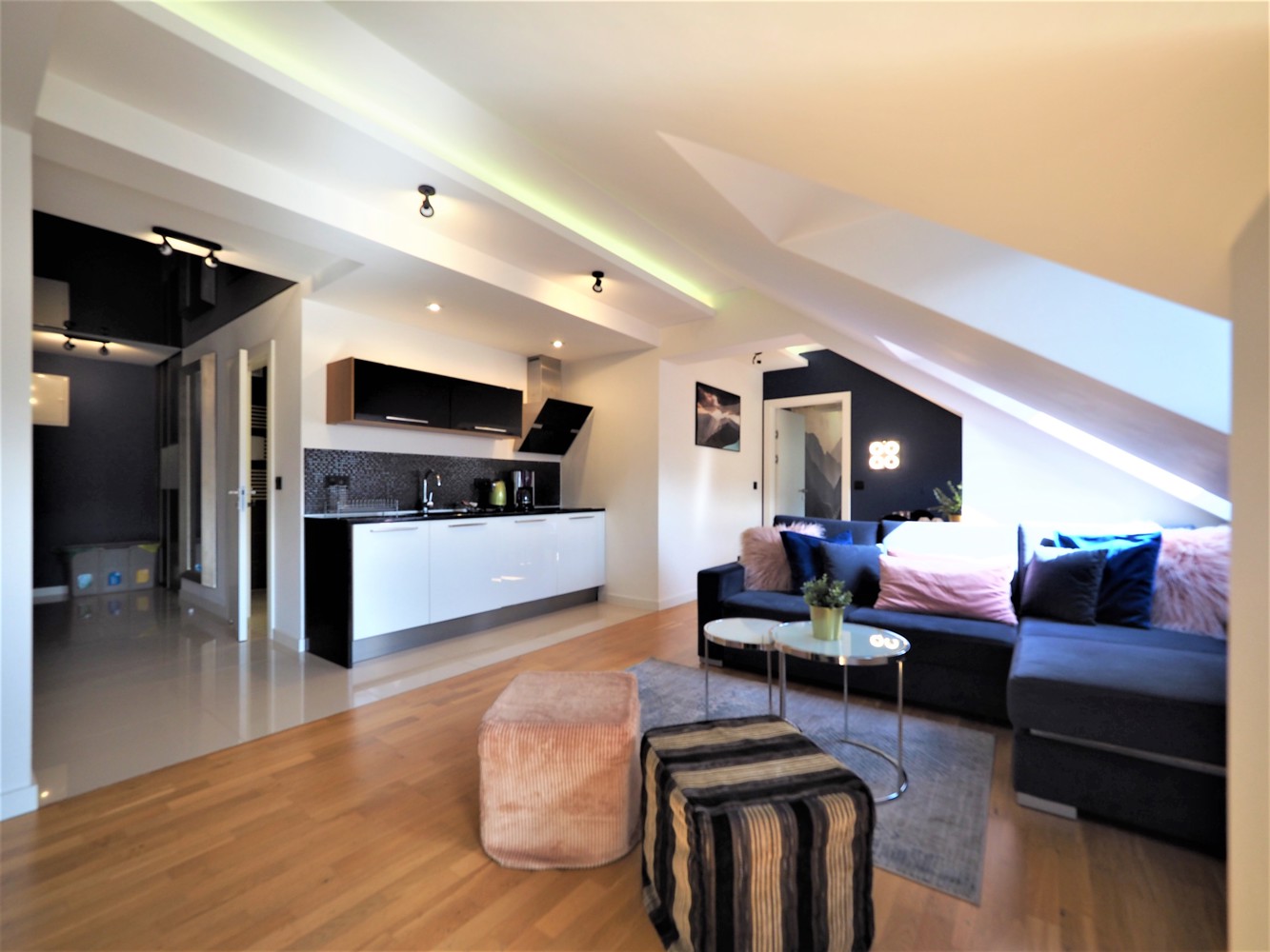 Apartament składa się z salonu z aneksem kuchennym, łazienki z WC i prysznicem oraz jednej sypialni.