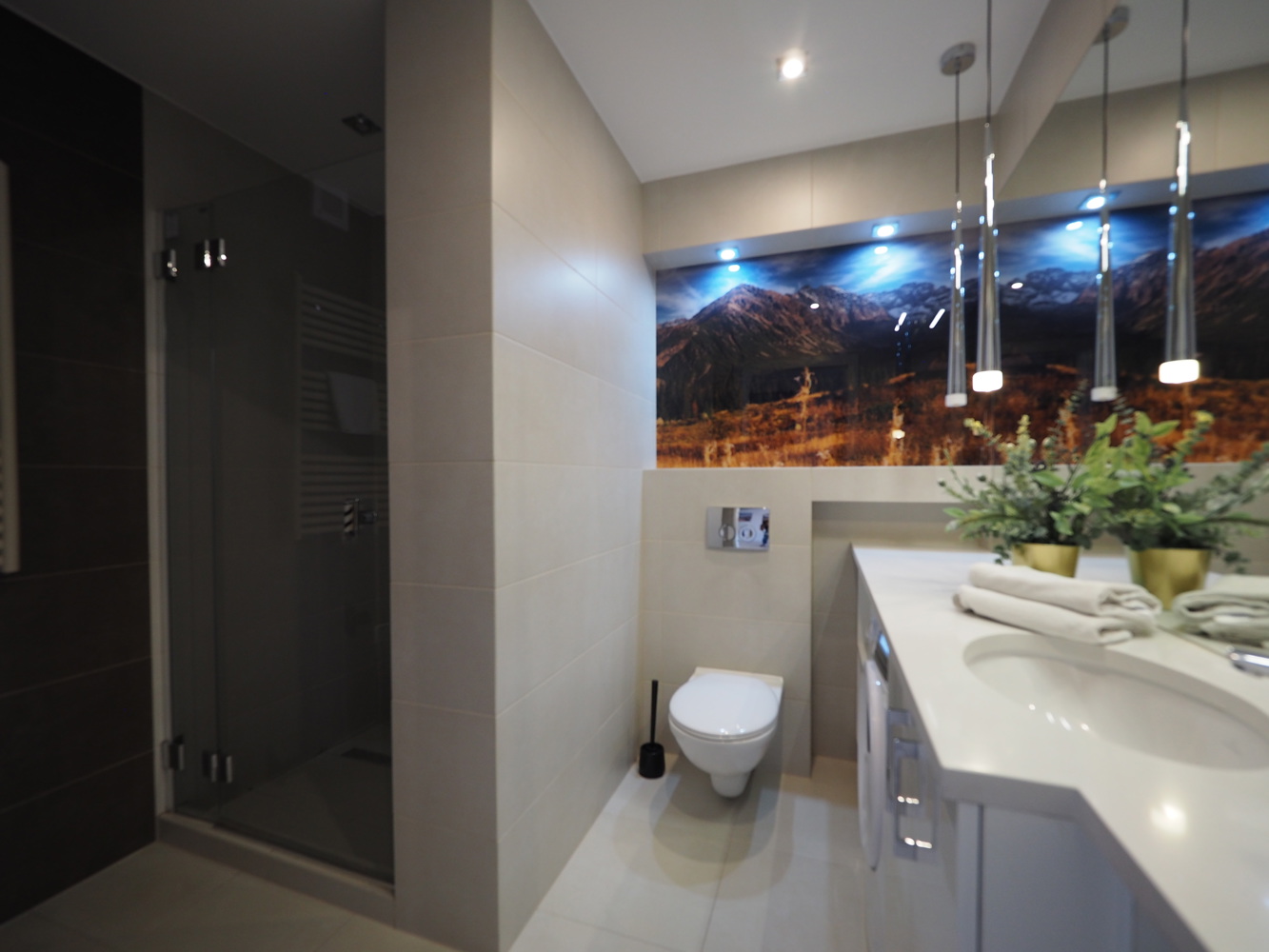 Łazienka z WC, prysznicem, pralką, suszarką do włosów.
